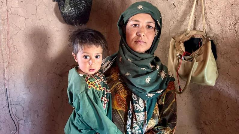 In one of the mud and clay homes, Hanifa Sayedi’s one-year-old son Rafiullah could barely hold himself up, even while he’s sitting.
