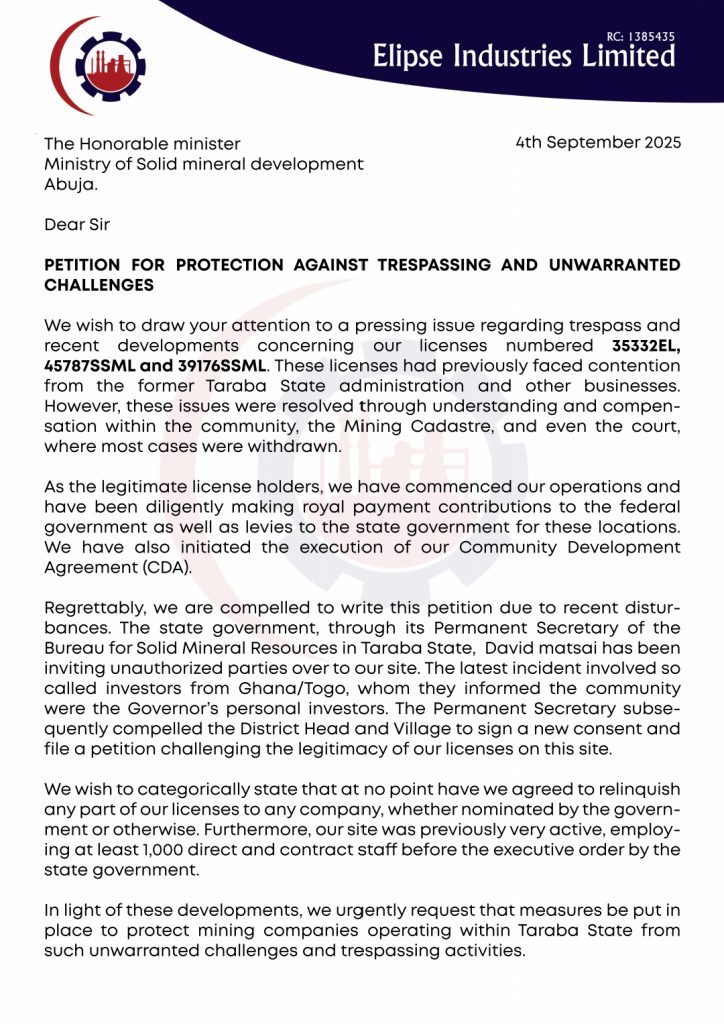 “In light of these developments, we urgently request that measures be put in place to protect mining companies operating within Taraba State from such unwarranted challenges and trespassing activities”, the petition reads.